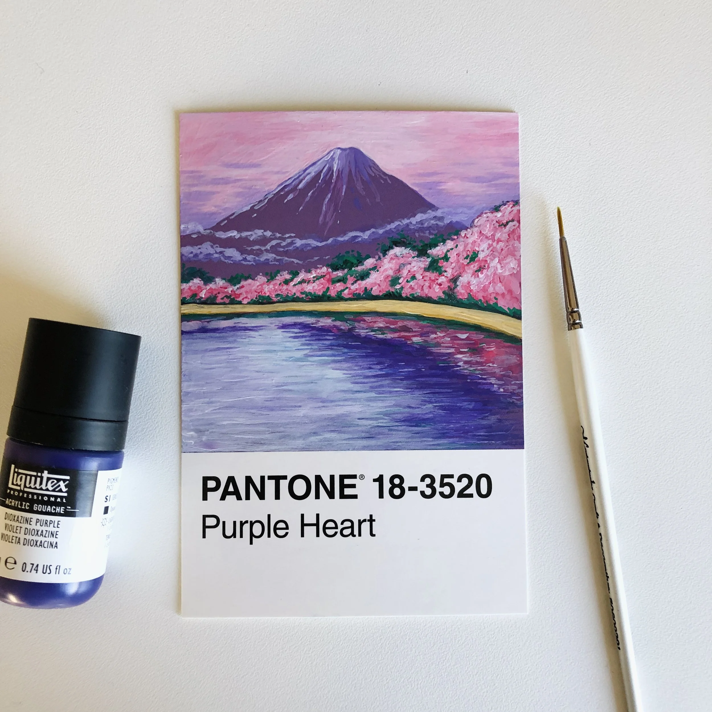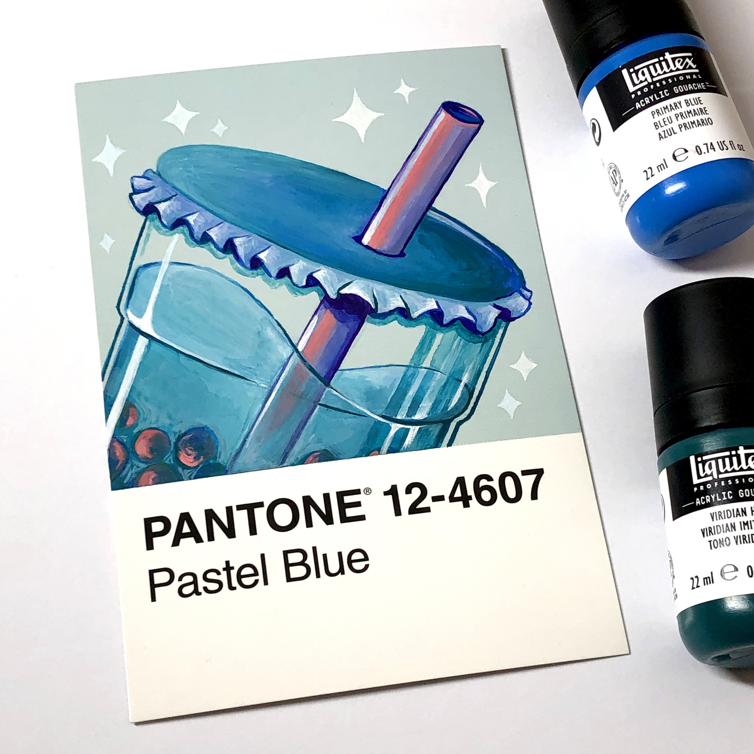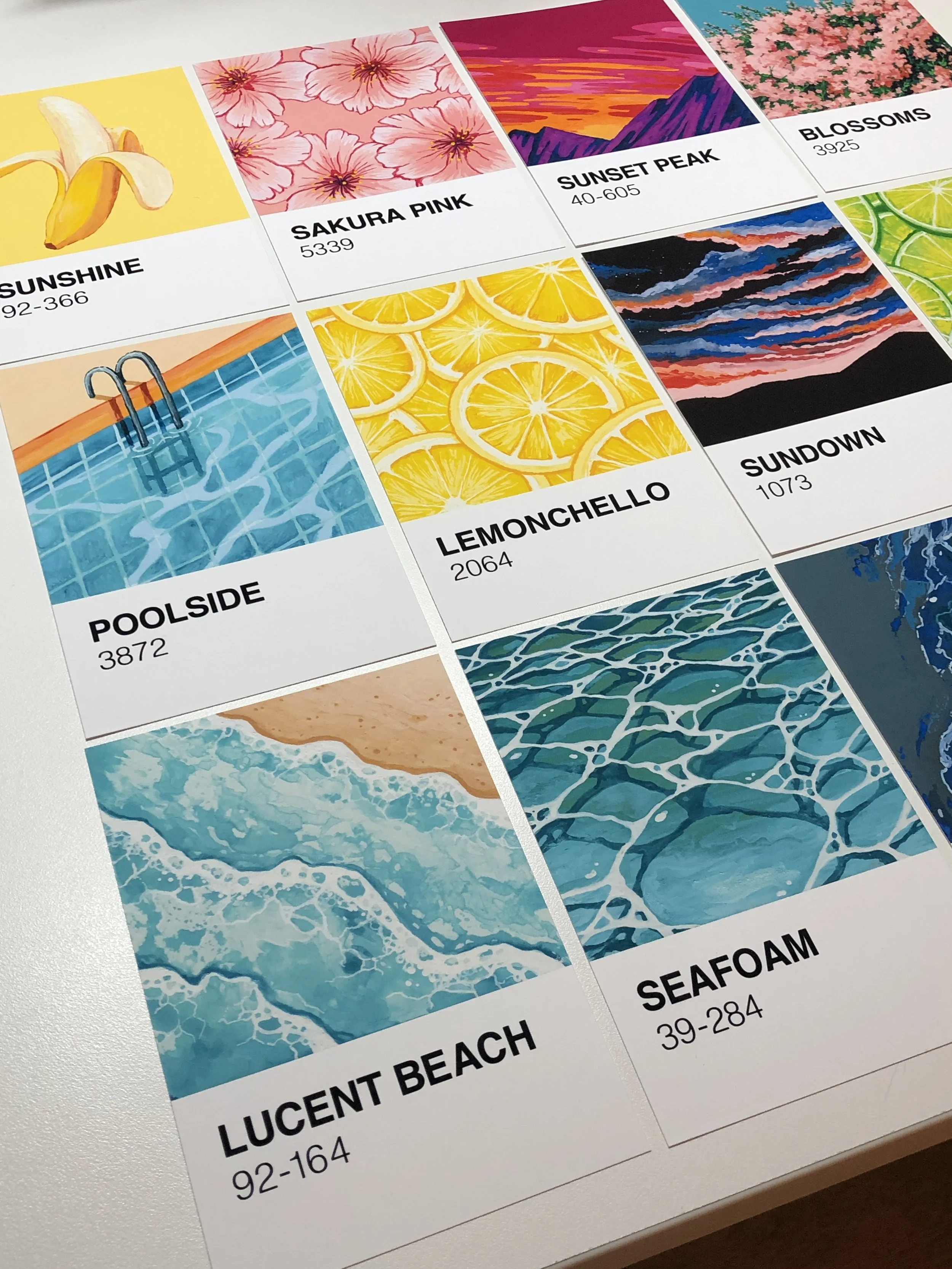 Back in 2020 like many people, I found myself with a lot of time on my hands. I got a dog, played a lot of animal crossing, and ate so much cake. I also ended up challenging myself to paint a box of 100 Pantone postcards. Each day I’d pick a card and use the colour as inspiration, trying to base a majority of the subject matter on the card. The postcards payed an interesting challenge, in that their glossy surface meant sketching wasn’t practical forcing me to embrace the lack of control I was used to. From this I gained a lot more confidence in freehand painting and a deeper love and understanding of colour.
