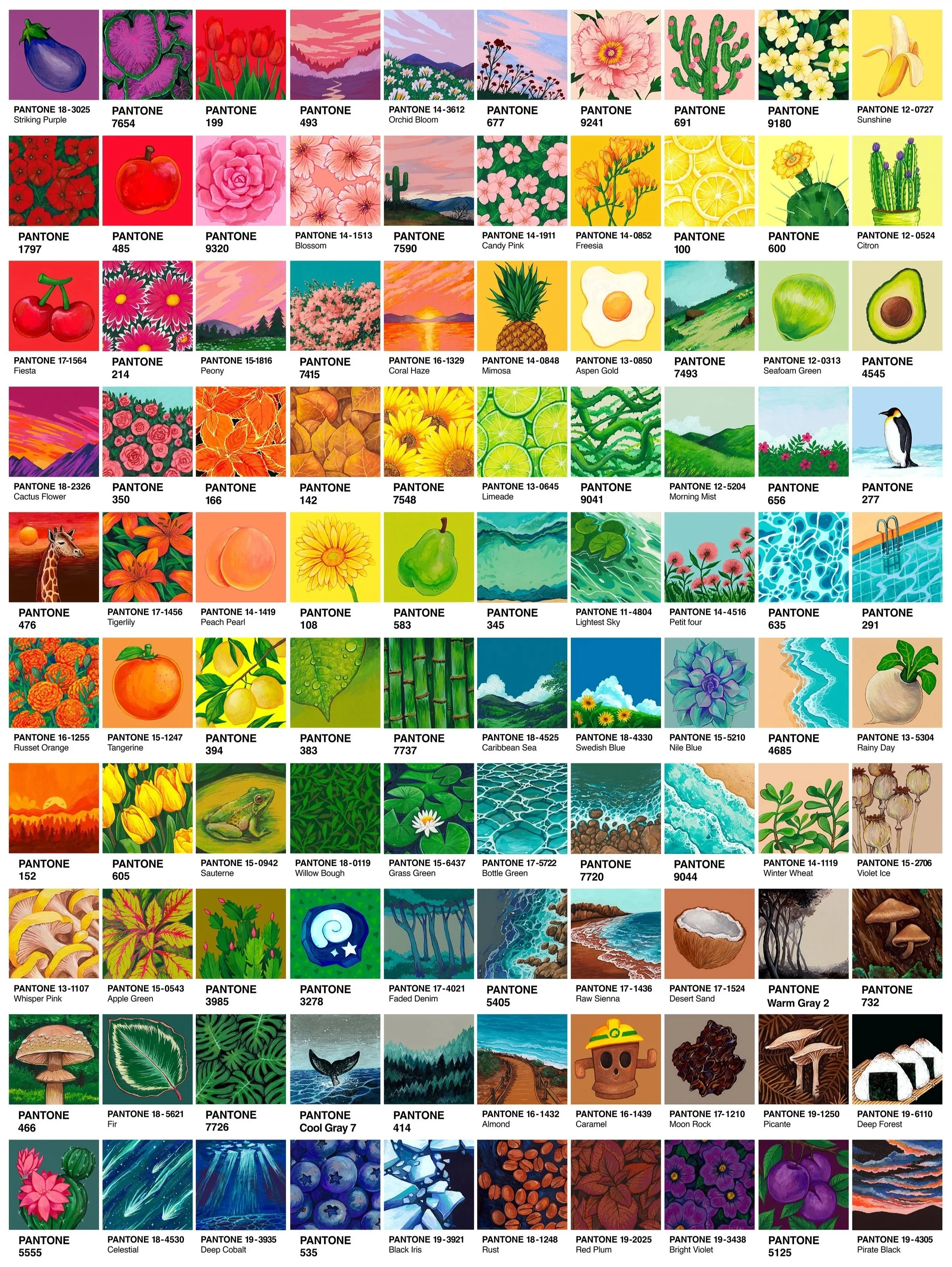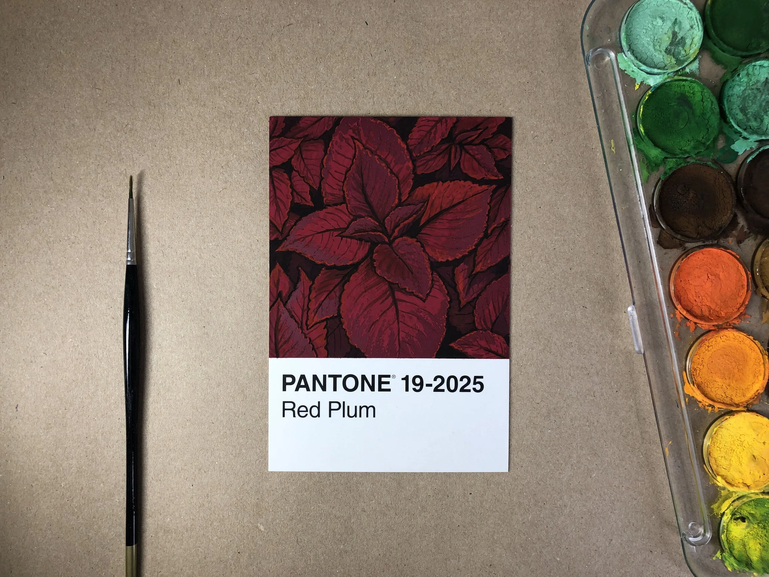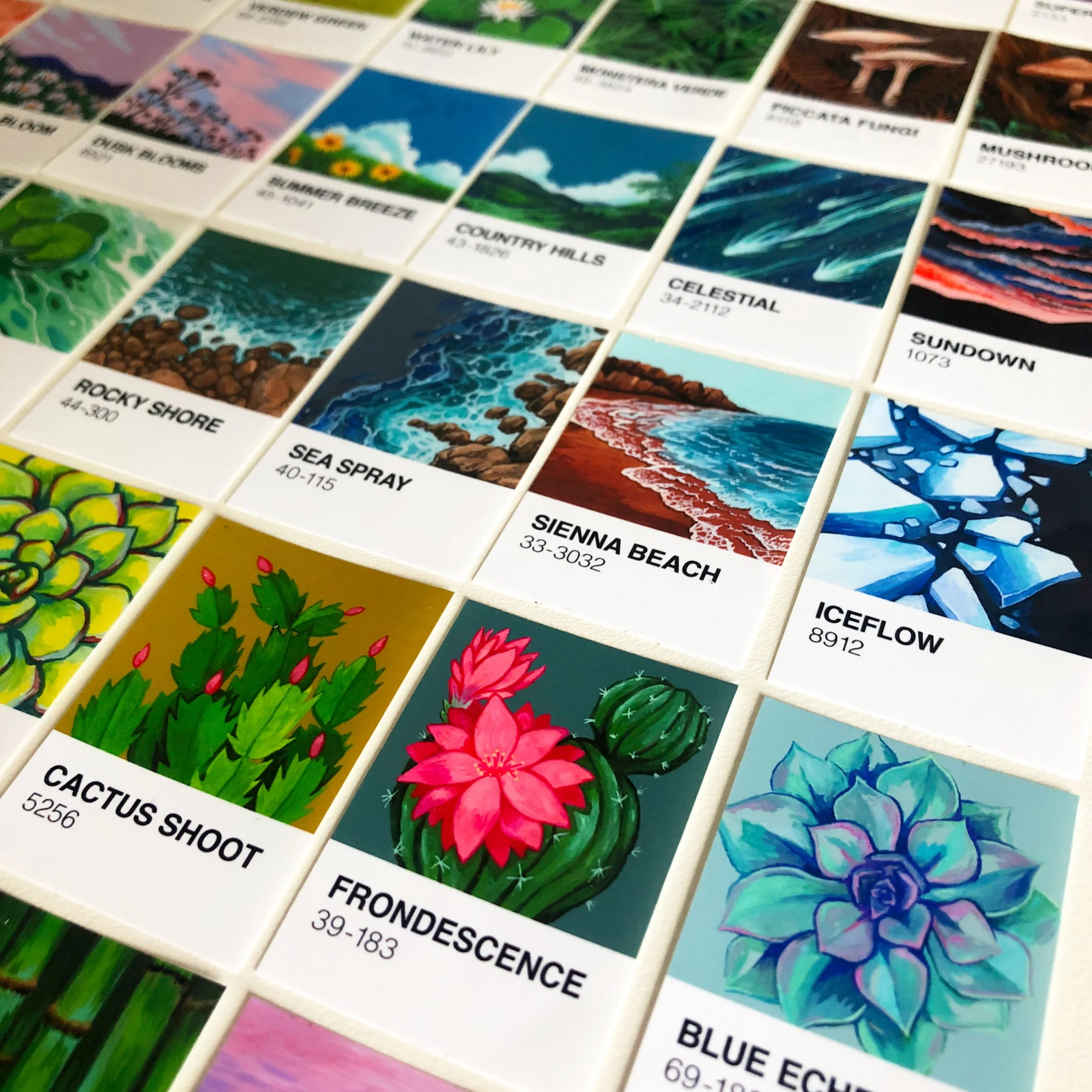 Back in 2020 like many people, I found myself with a lot of time on my hands. I got a dog, played a lot of animal crossing, and ate so much cake. I also ended up challenging myself to paint a box of 100 Pantone postcards. Each day I’d pick a card and use the colour as inspiration, trying to base a majority of the subject matter on the card. The postcards payed an interesting challenge, in that their glossy surface meant sketching wasn’t practical forcing me to embrace the lack of control I was used to. From this I gained a lot more confidence in freehand painting and a deeper love and understanding of colour.