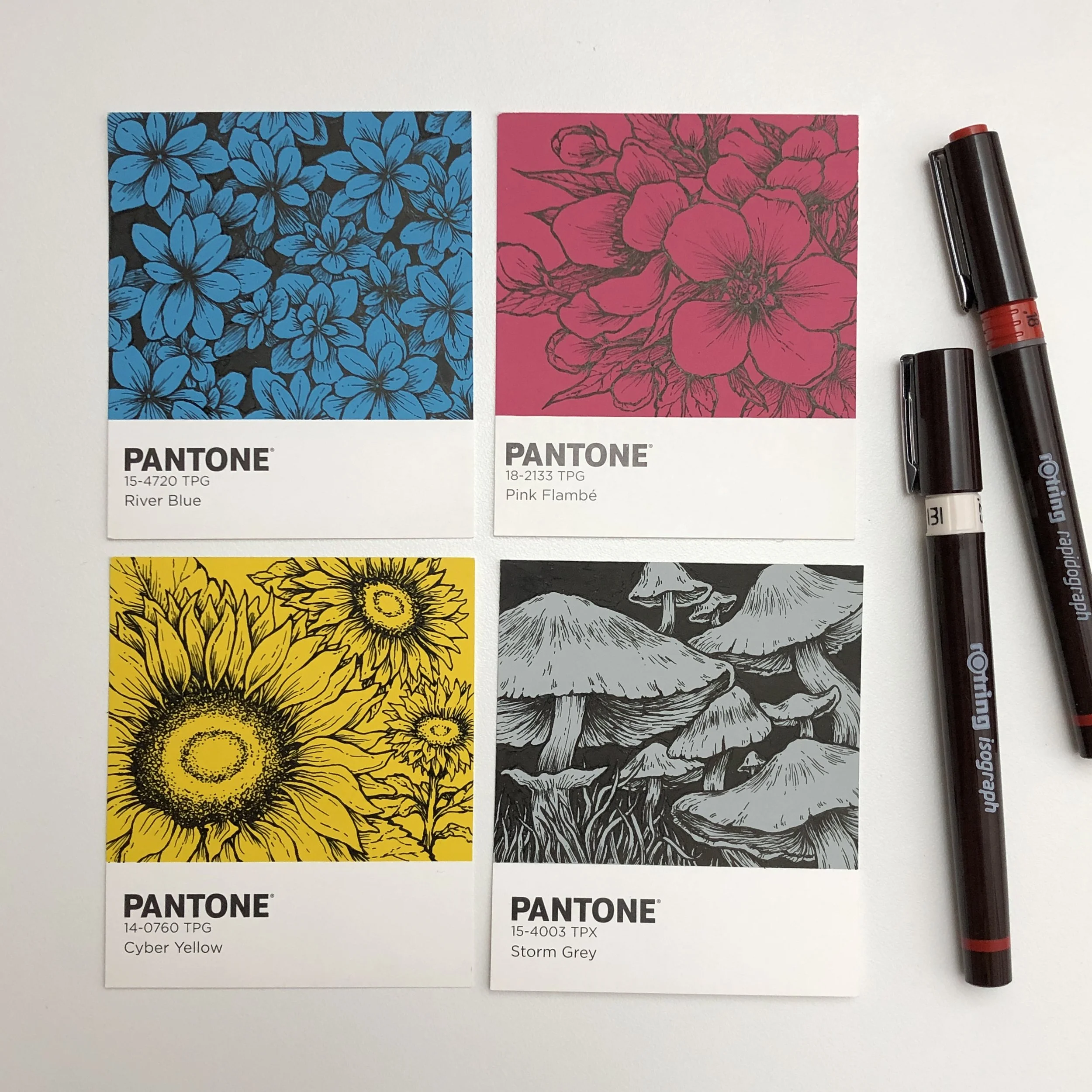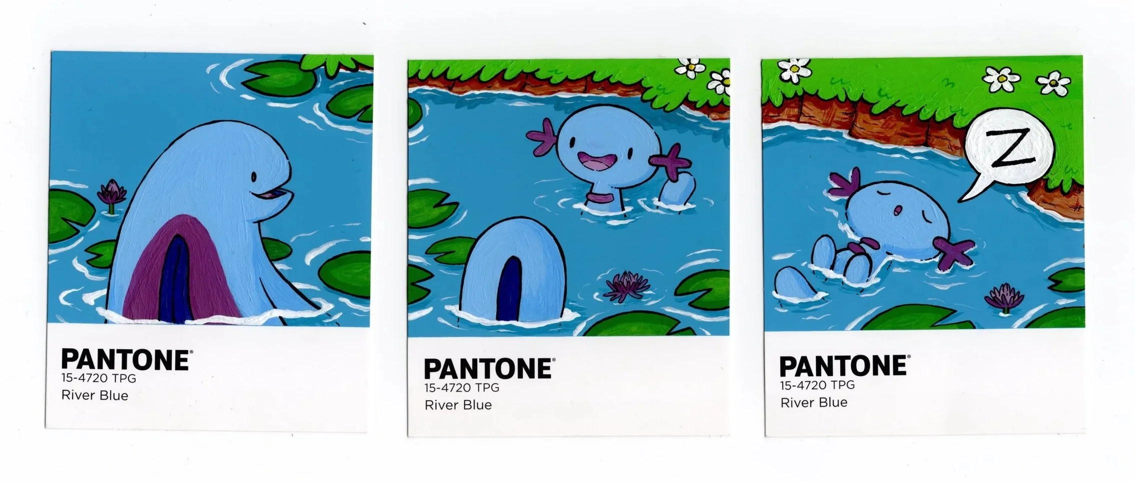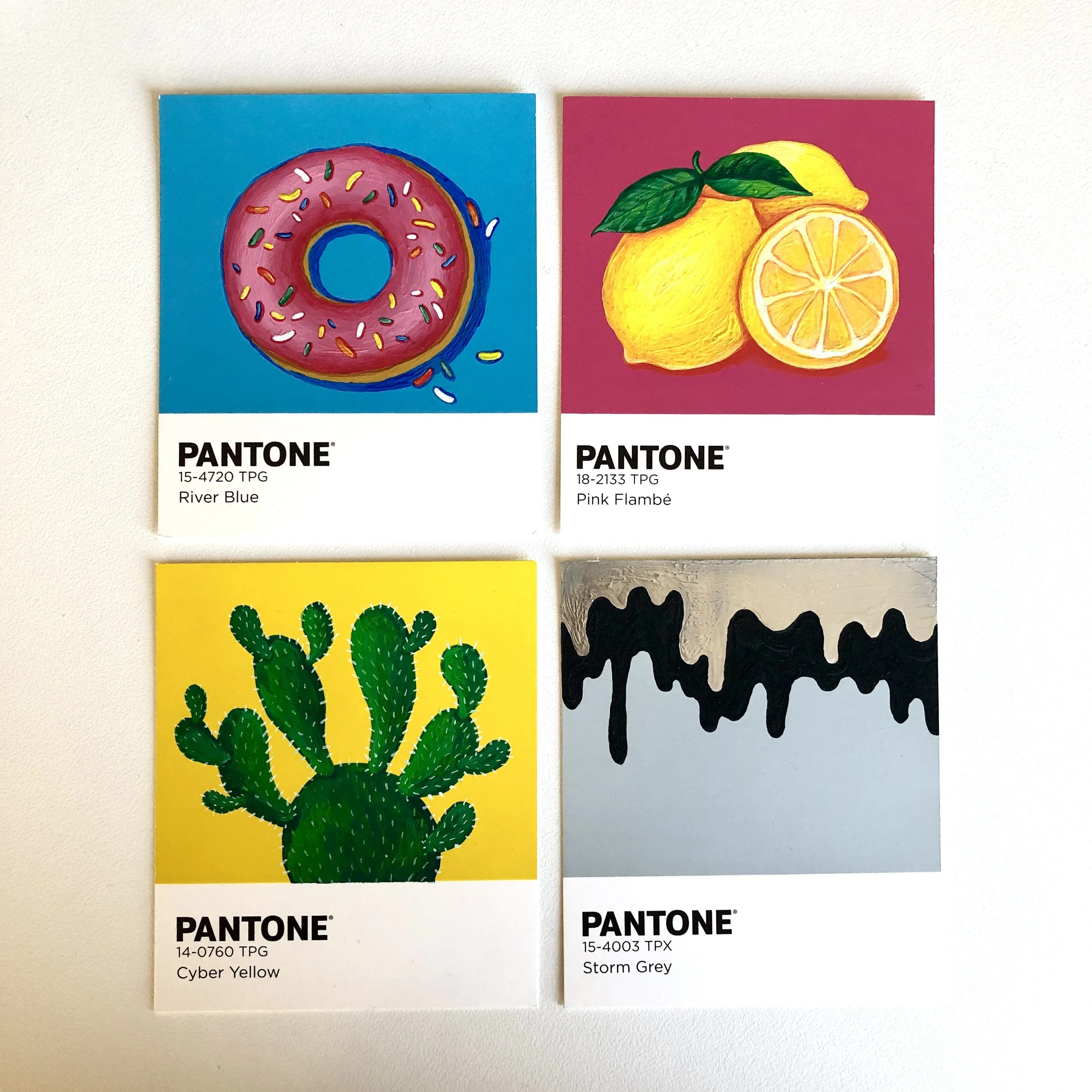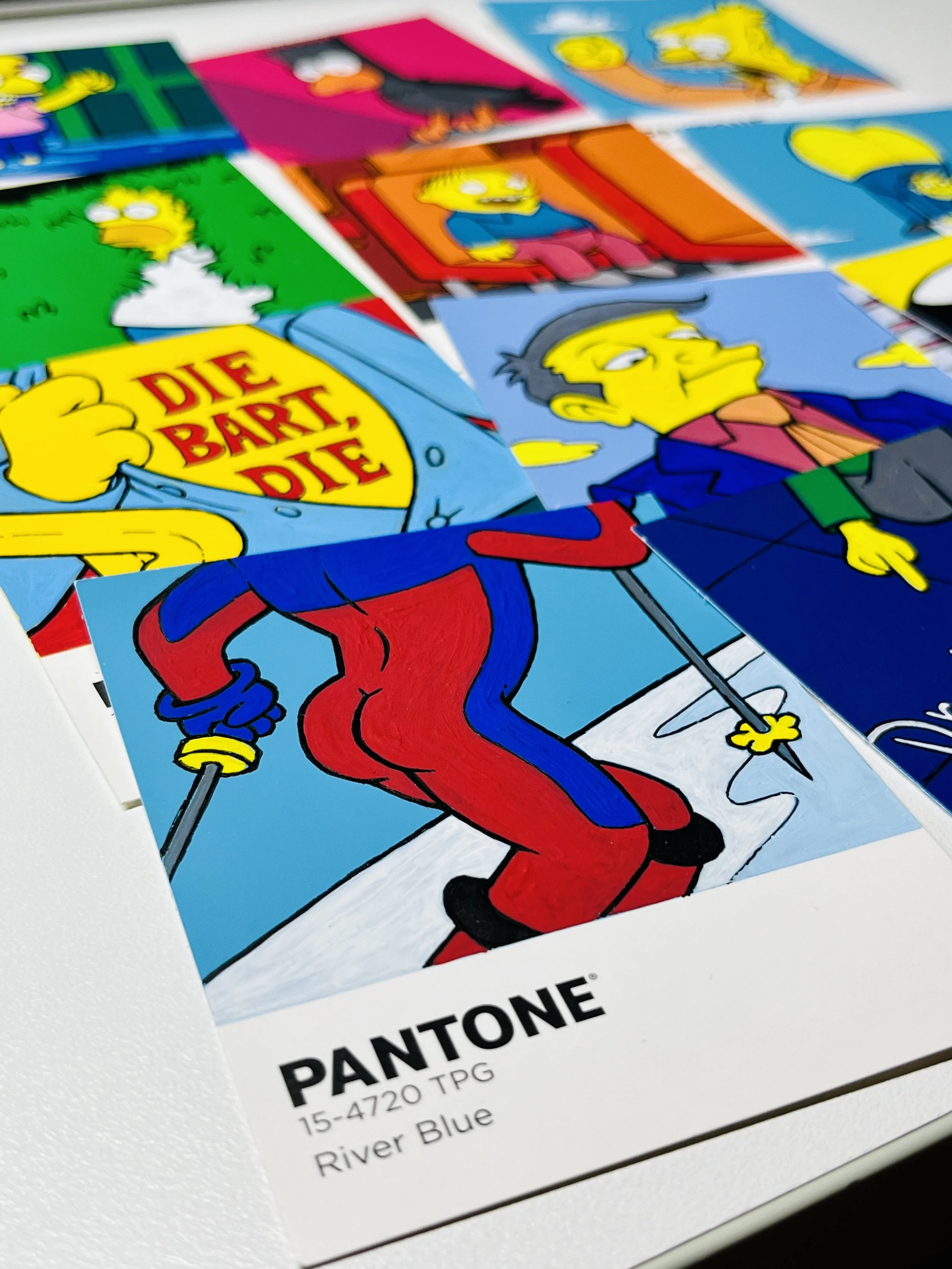 An extension of my postcard project, I found myself purchasing 466 Pantone paint samples on ebay (about 33 different colours of varying amounts) with the idea of using them for art projects. I pull them out from time to time to make sets as gifts for friends, featuring a variety of subjects from Pokemon, the Simpsons, and video games. As a result I am now known to raid hardware stores for their paint samples to collect other mini canvases I can draw or paint on!